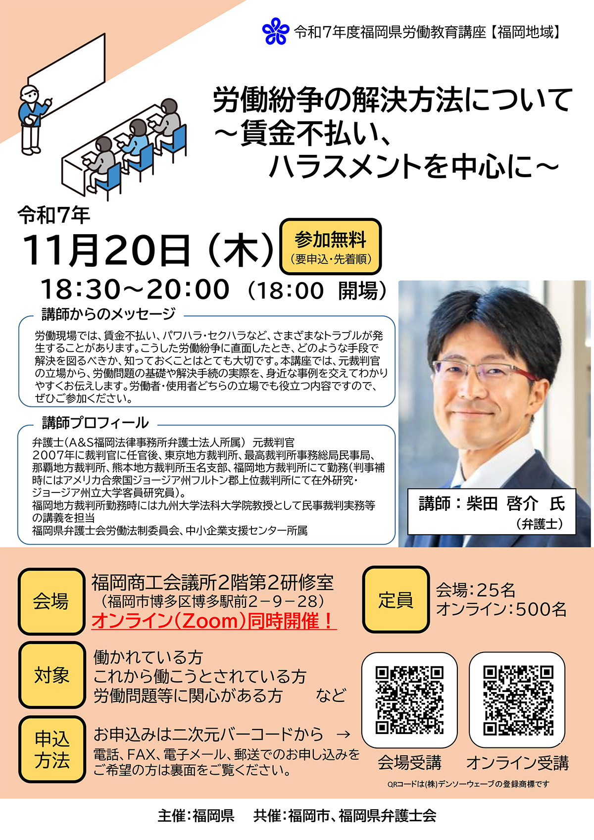 - 【福岡県労働教育講座】「労働紛争の解決方法について~賃金不払い、ハラスメントを中心に~」のご案内