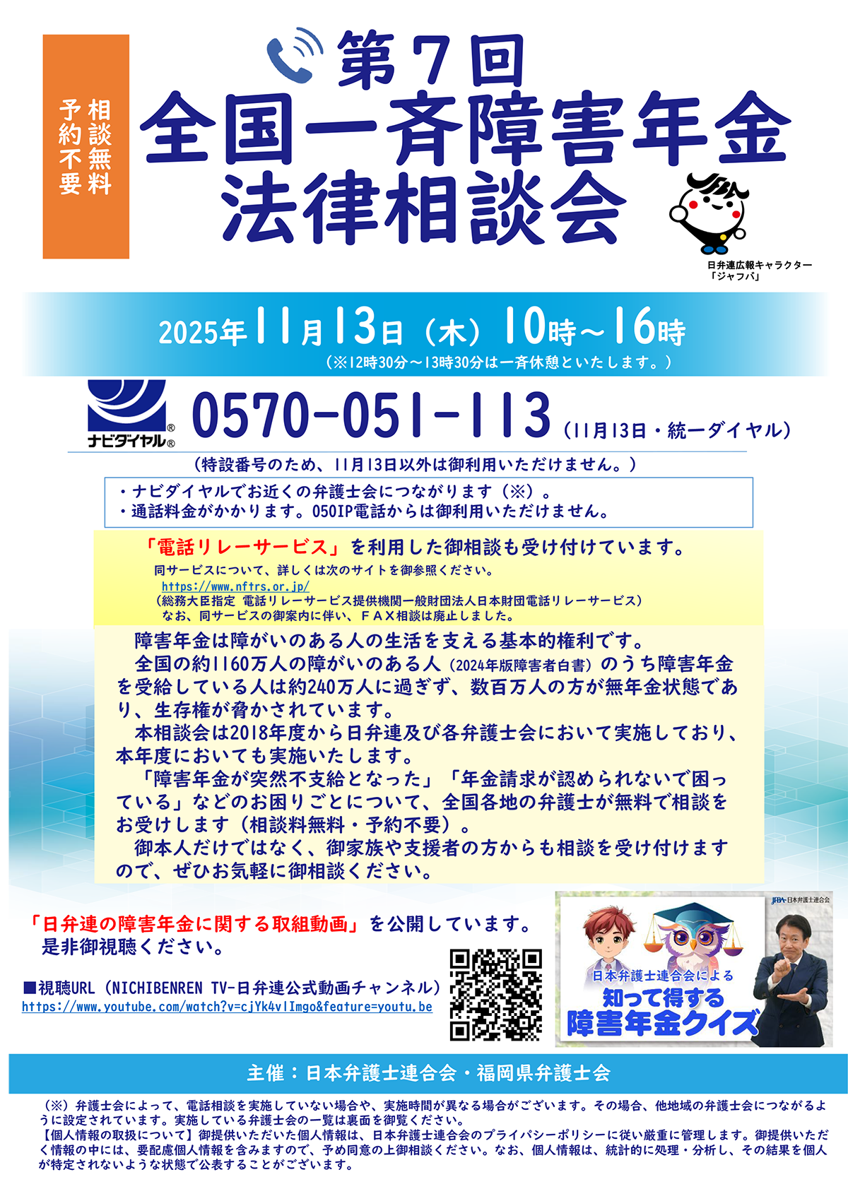 そのため、2018年度から開始している全国一斉障害年金電話法律相談会を日弁連及び各弁護士会において、本年度も実施いたします。