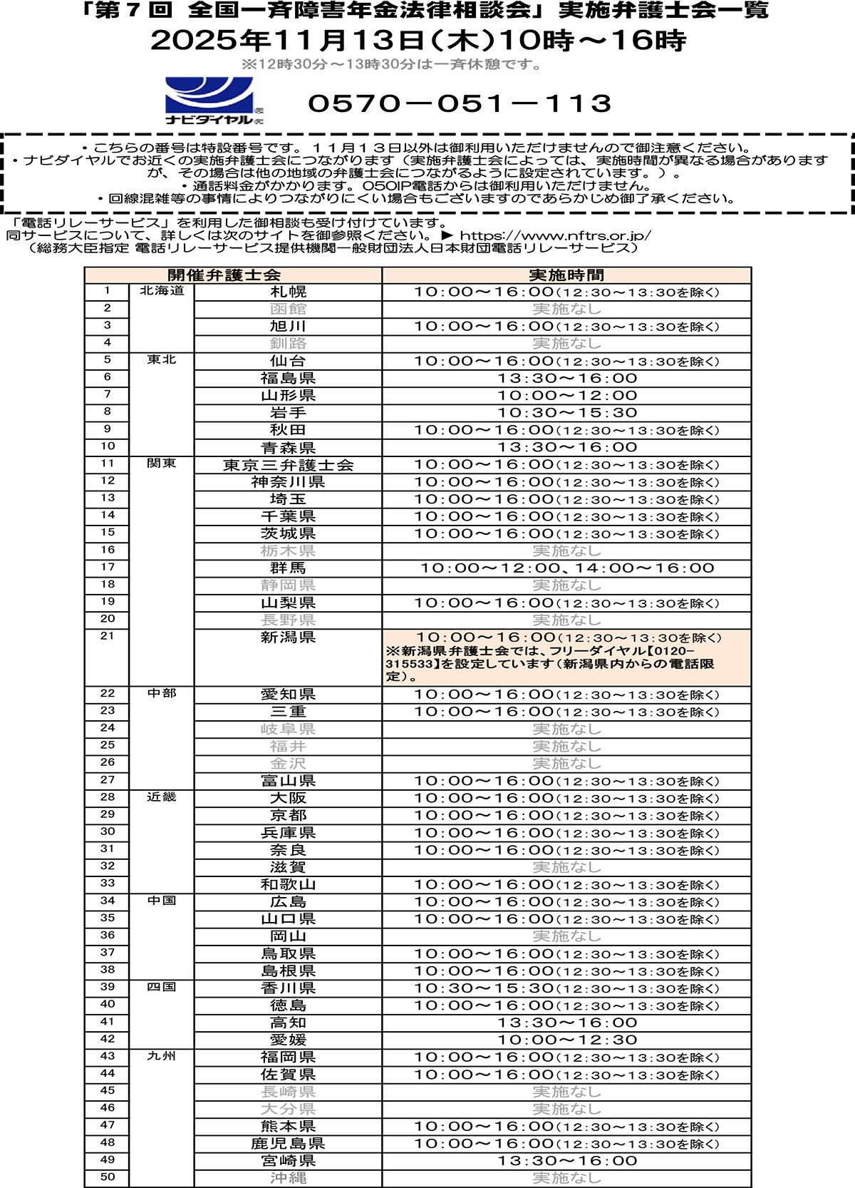 「障害年金が突然不支給になった」「年金請求が認められないで困っている」などのお困りごとについて、全国各地の弁護士が無料で相談をお受けします(相談料無料・予約不要)。