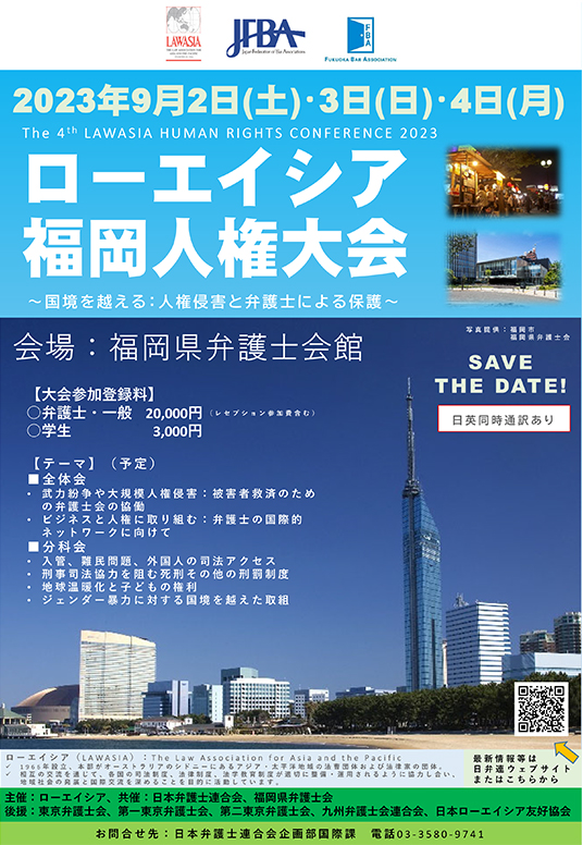 今年9月2日(土)から4日(月)まで、ローエイシア(LAWASIA)(アジア・太平洋地域の法曹団体および法律家の団体)の人権大会が福岡県弁護士会館で開催されます。昨年度の常議員会の承認を得て、当会は、日弁連とともに、ローエイシア福岡人権大会を共催します。