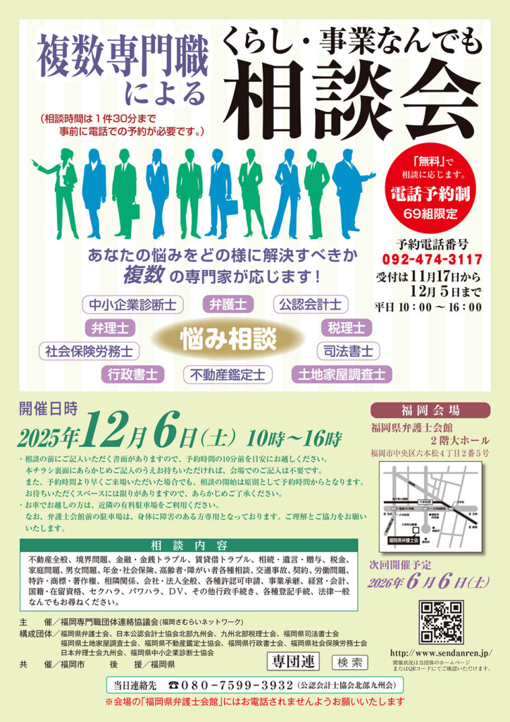 福岡専門職団体連絡協議会では、「くらし・事業なんでも相談会」を下記の要領で開催することになりました。